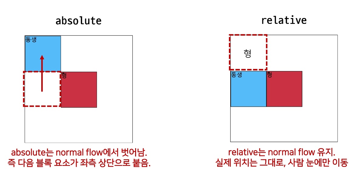 형이 더이상 원래 위치를 차지하지 않고 top 100px; left 100px만큼 이동한다