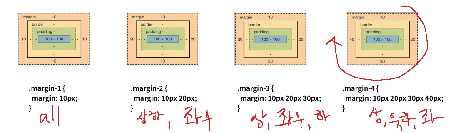 margin: 10px;, 20px; 30px; 40px;은 상,우,하,좌 각각 10,20,30,40px