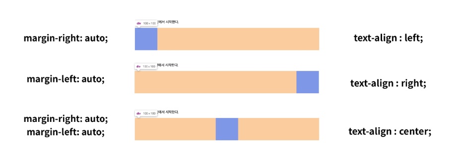 auto;는 여백을 알아서 주겠다는 의미로, margin-left:auto;는 왼쪽에 여백을 알아서 가득 주고, margin-right:auto;는 오른쪽에 여백을 알아서 준다.