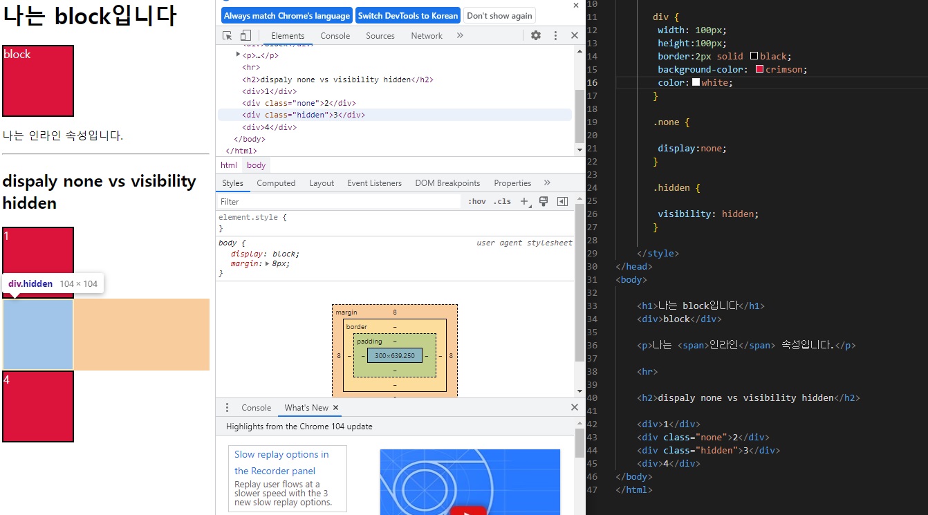 위 그림과 같이 none으로 준 div는 아예 사라졌고, hidden으로 준 박스는 공간은 차지하는데 보이지 않아