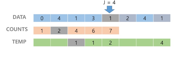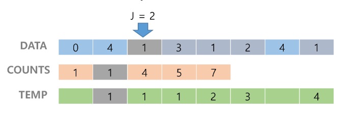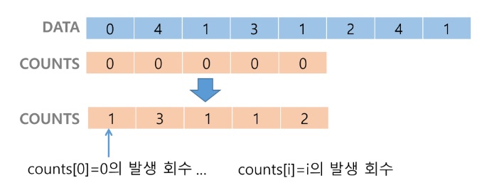 - 각 항목의 발생 횟수를 기록하고자 정수로 인덱스 되는 카운팅 배열을 사용하기 때문