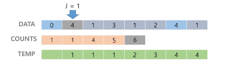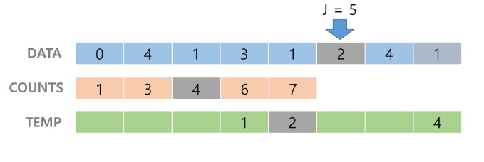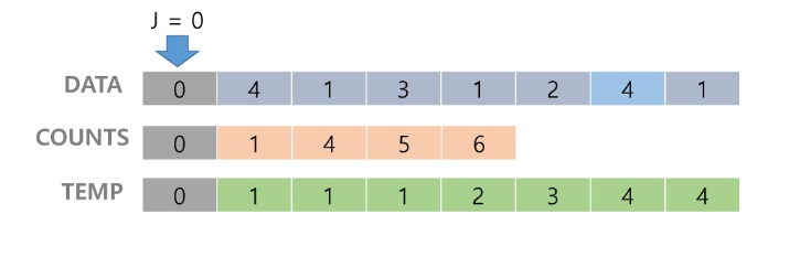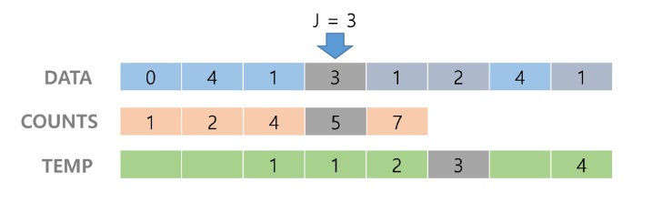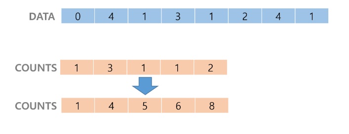 그러므로 count_list = [1,3,1,1,2]이고, 이것만 보고도 바로 정렬을 수행할 수 있다
