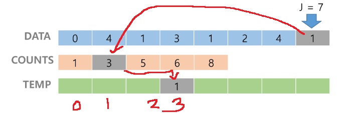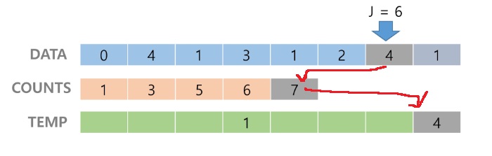 역시 4를 하나 정렬했으니까 누적합배열에서 1을 빼줘서 7로 만들고.. 이런식으로 계속 읽어나간다