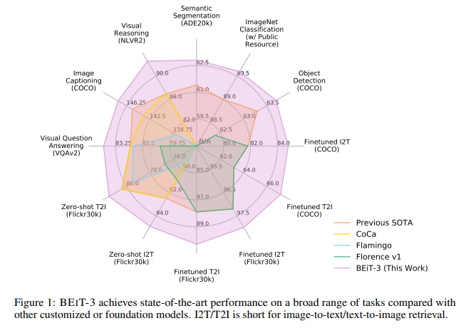 위 그림에서 BEiT-3이 다양한 vision, vision-language task에서 SOTA 성능을 보인다는 것을 보여준다.