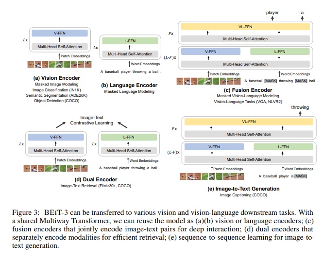 그림3에서 볼 수 있듯이, 하나의 통합된 구조는 BEiT-3이 넓은 범위의 downstream task를 지원해준다. 예를 들어 BEiT-3은 다양한 vision task(image classification, object detection, instance segmentation, semantic segmentation)를 위한 image backbone으로 사용될 수 있다