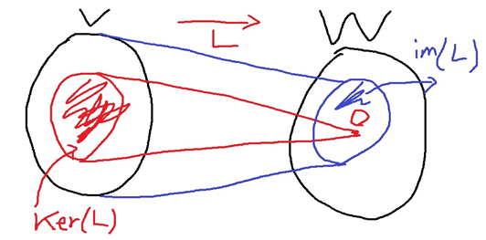 이 때, $L$의 kernel인 ker(L)은 $V$의 원소중 $L:V -> W$에 의해 $W$의 zero vector로 mapping되는 모든 원소의 집합을 말합니다.