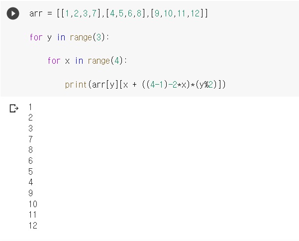 행 y가 짝수이면.. 0~m-1 순회하고 홀수이면 m-1~0 순회하도록