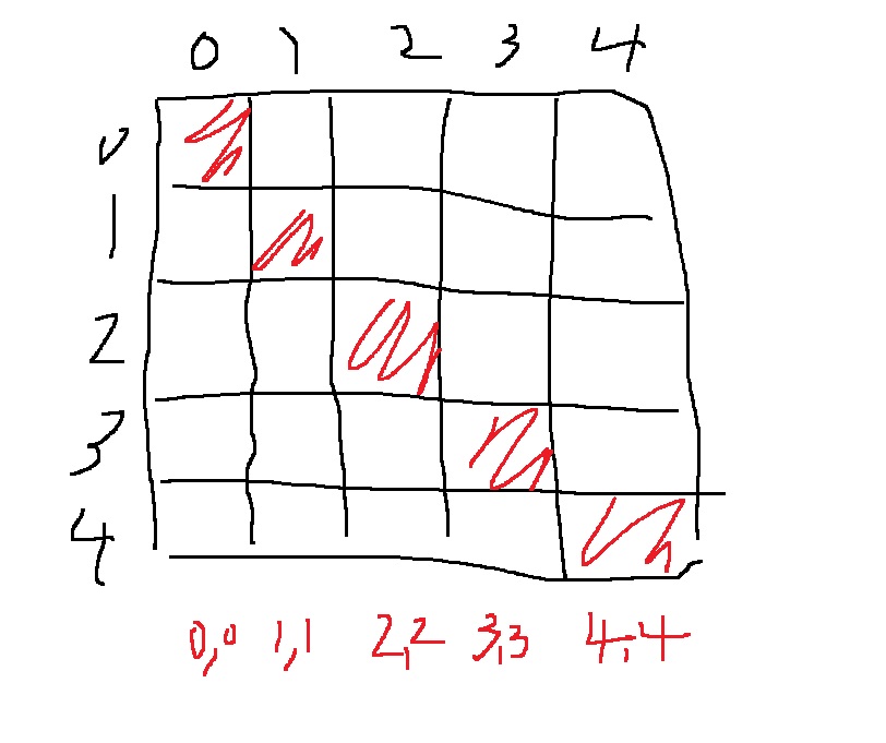 왼쪽에서 오른쪽으로 내려가는 대각선은 x,y 좌표가 서로 같다