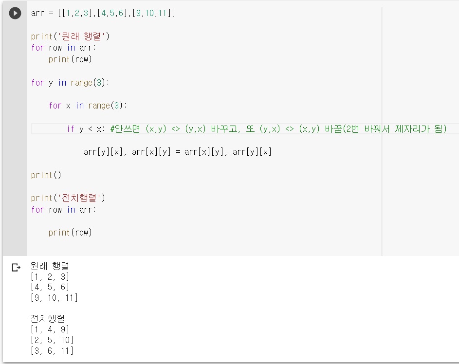 전치행렬은 정방행렬에서 x,y 좌표의 값과 y,x 좌표의 값을 서로 뒤바꾼 행렬이다