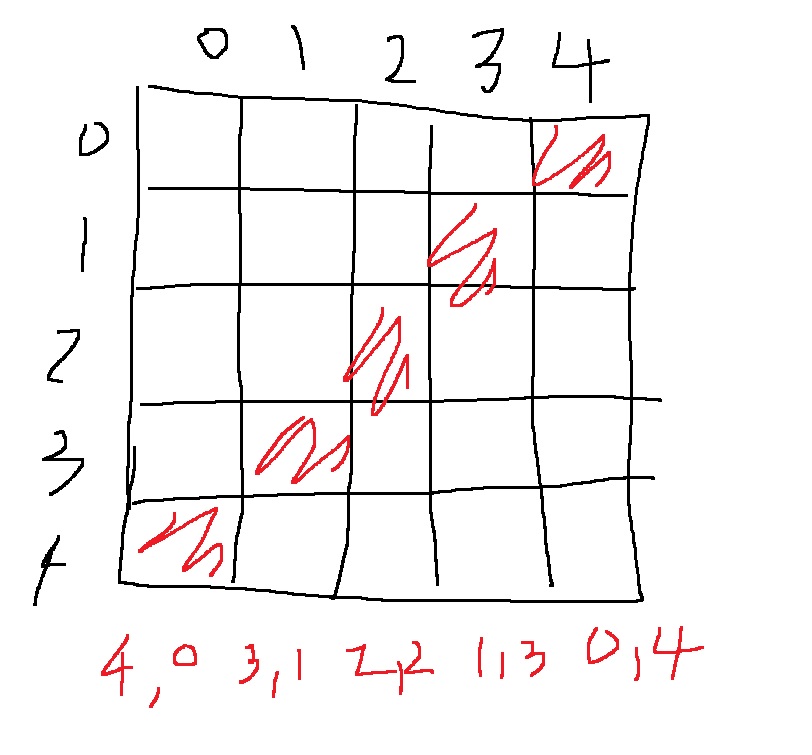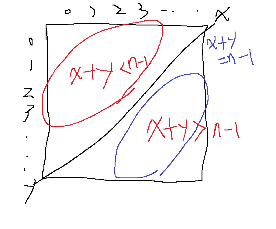 n*n 배열에서 자세히 보면 x,y의 합 x+y가 n-1과 같은 x,y는 오른쪽 위에서 왼쪽 아래로 내려가는 대각선과 같다