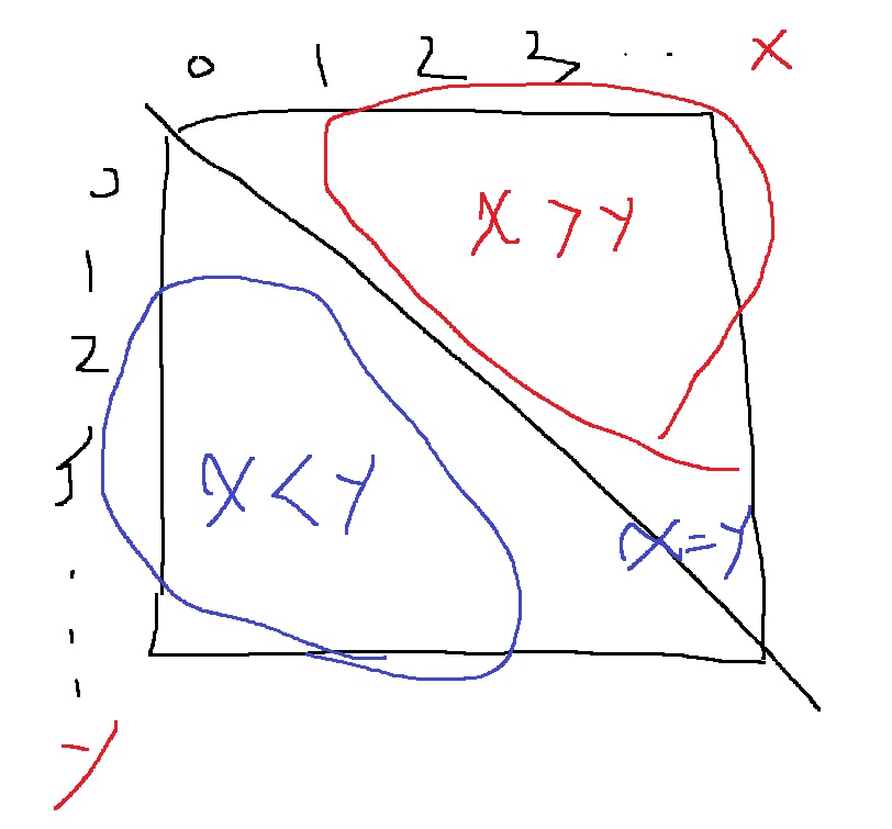 x좌표가 y좌표보다 큰 부분은 빨간색 부분이고 작은 부분은 파란색 부분