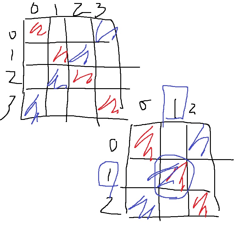 위에서 볼 수 있듯이 4*4배열은 0~3까지 나타난다면, 사선상에 배치할 수 있는 인덱스는 0~6까지이다.