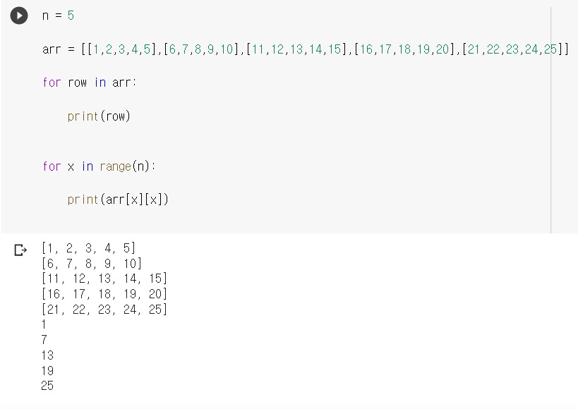 arr = [[1,2,3,4,5],[6,7,8,9,10],[11,12,13,14,15],[16,17,18,19,20],[21,22,23,24,25]]