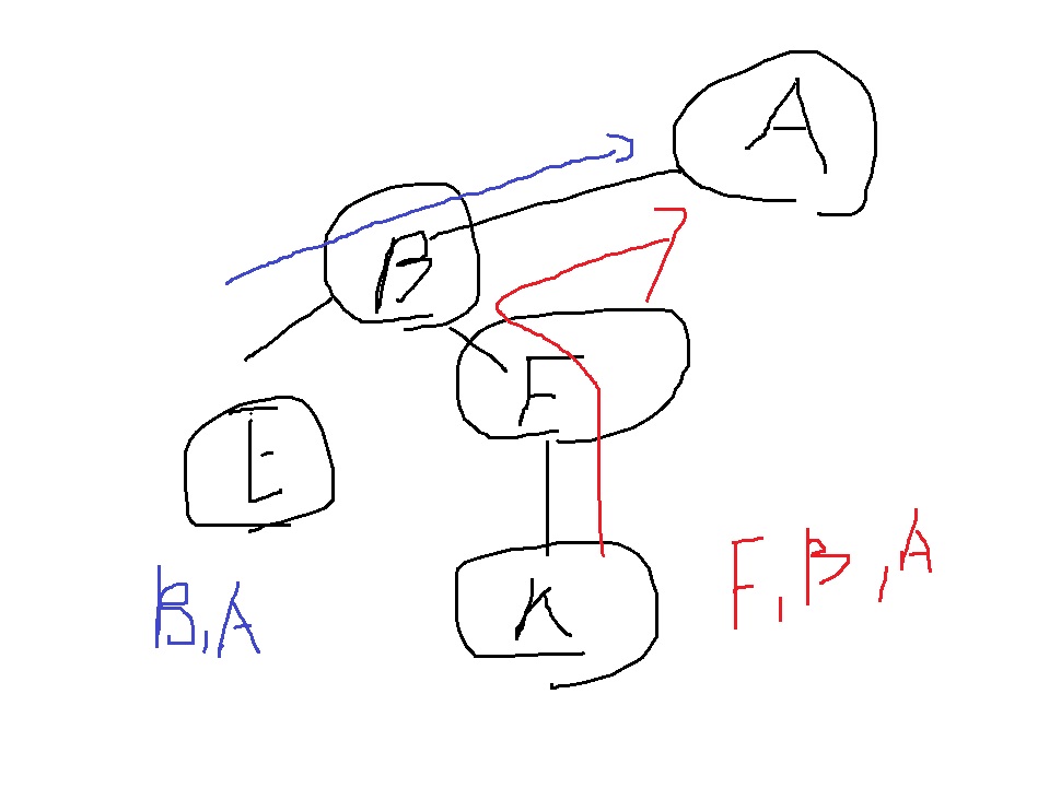 K의 조상은 F,B,A이고 E의 조상은 B,A이다