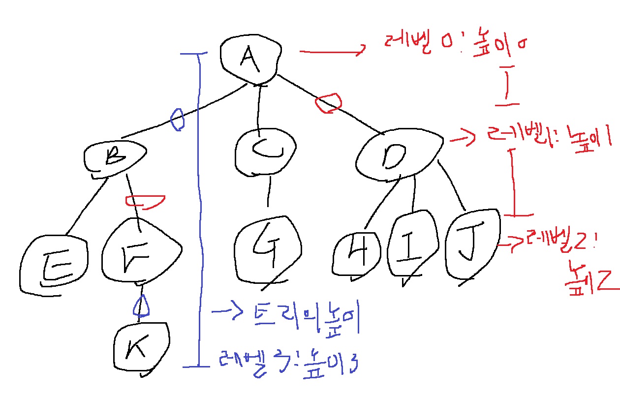 K는 A에 이르는 간선의 수가 3개이므로 레벨3, 높이3인 노드