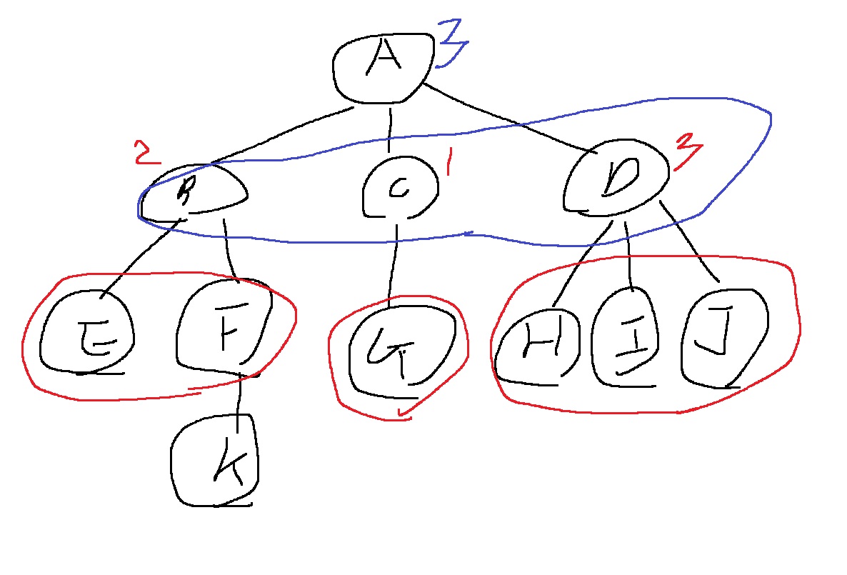 E,F,G,H,I,J는 A에 이르는 간선의 수가 2개이므로 레벨2, 높이2인 노드들