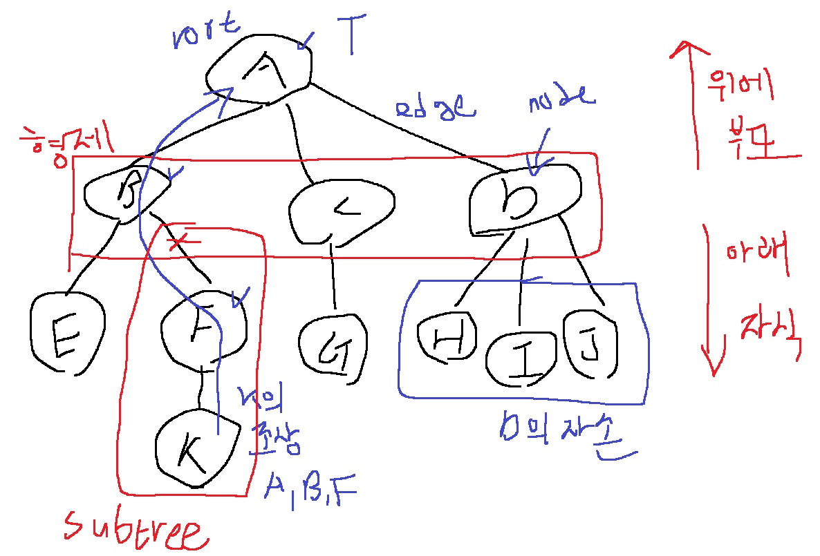 더 이상 밑에 연결된 노드가 없는 E,K,G,H,I,J(파란색으로 칠해진 노드)는 단말 노드, 잎 노드(leaf)라고 부른다