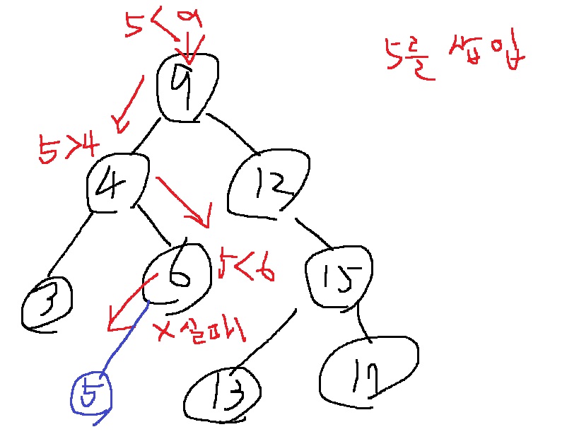 5를 삽입하고자 할때, 9부터 탐색을 시작