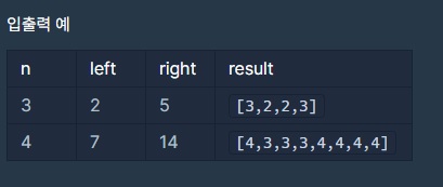 정수 n, left, right가 주어집니다. 다음 과정을 거쳐서 1차원 배열을 만들고자 합니다. n행 n열 크기의 비어있는 2차원 배열을 만듭니다. i = 1, 2, 3, ..., n에 대해서, 다음 과정을 반복합니다. 1행 1열부