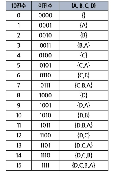 예를 들어 0010은 1번째 비트값이 1이므로 {a,b,c,d}에서 1번째 원소인 b를 선택한 {b}를 나타내고