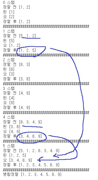 그렇다면 중간에 분할된 리스트와 병합되는 리스트를 출력해서 비교해보면 된다