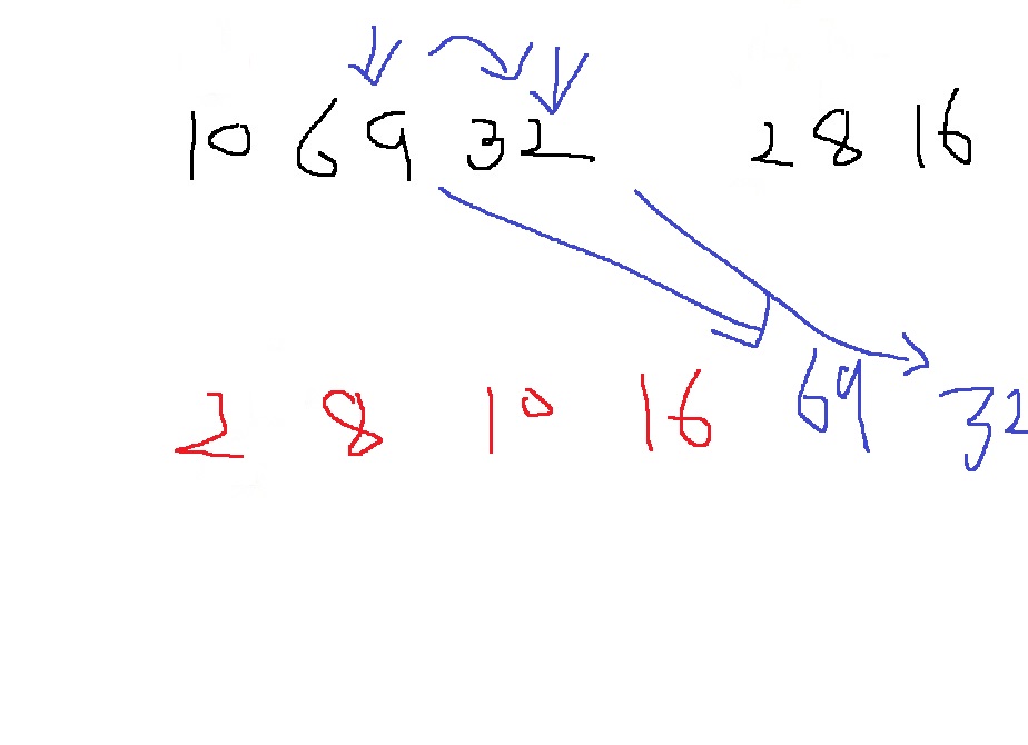다시 10과 8을 비교하면, 8이 더 작아서, 8을 집어넣고, 오른쪽 포인터를 1 증가