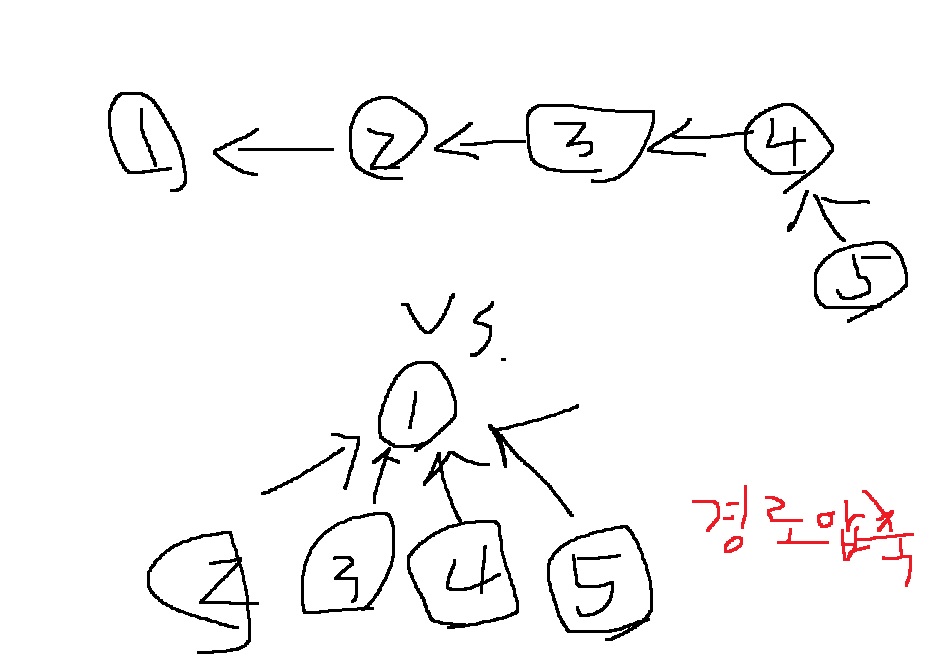 예를 들어 {1,2,3,4,5}에서 (4,5), (3,4), (2,3), (1,2)를 union하면 경로 압축을 하지 않을 때와 경로 압축을 할때 비교해보면..