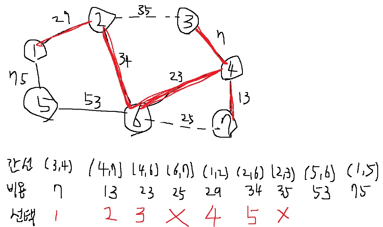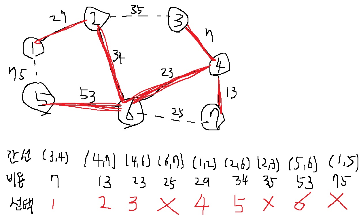 3) 모든 간선에 대하여 2)를 반복하여, n-1개의 간선을 선택하면 종료