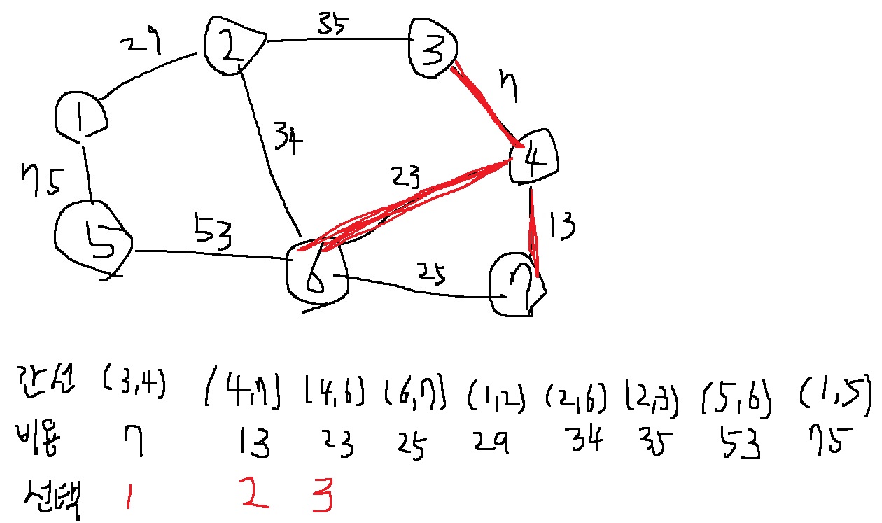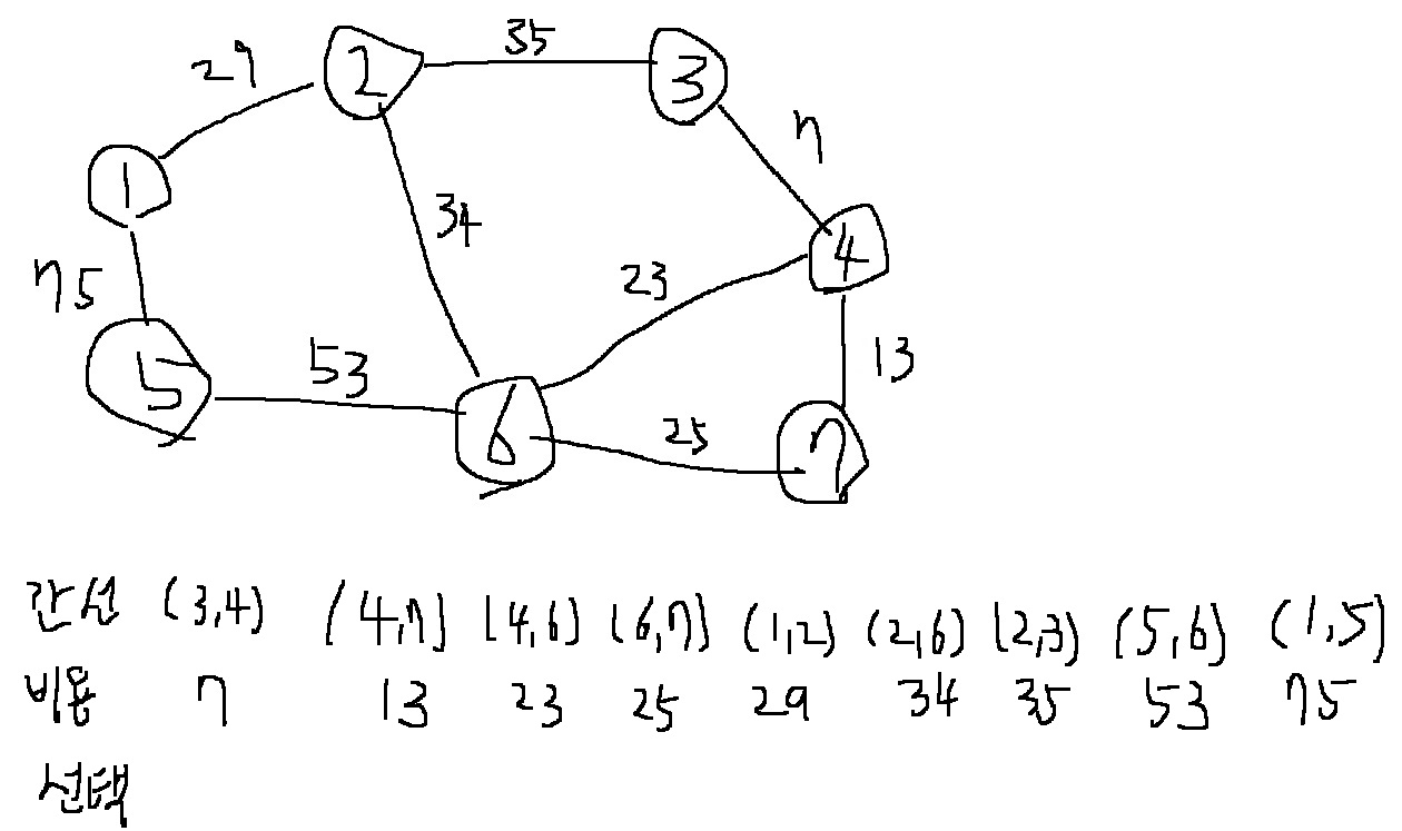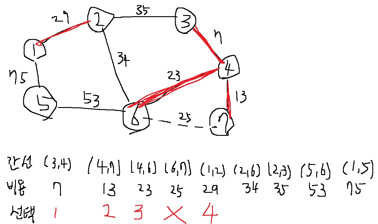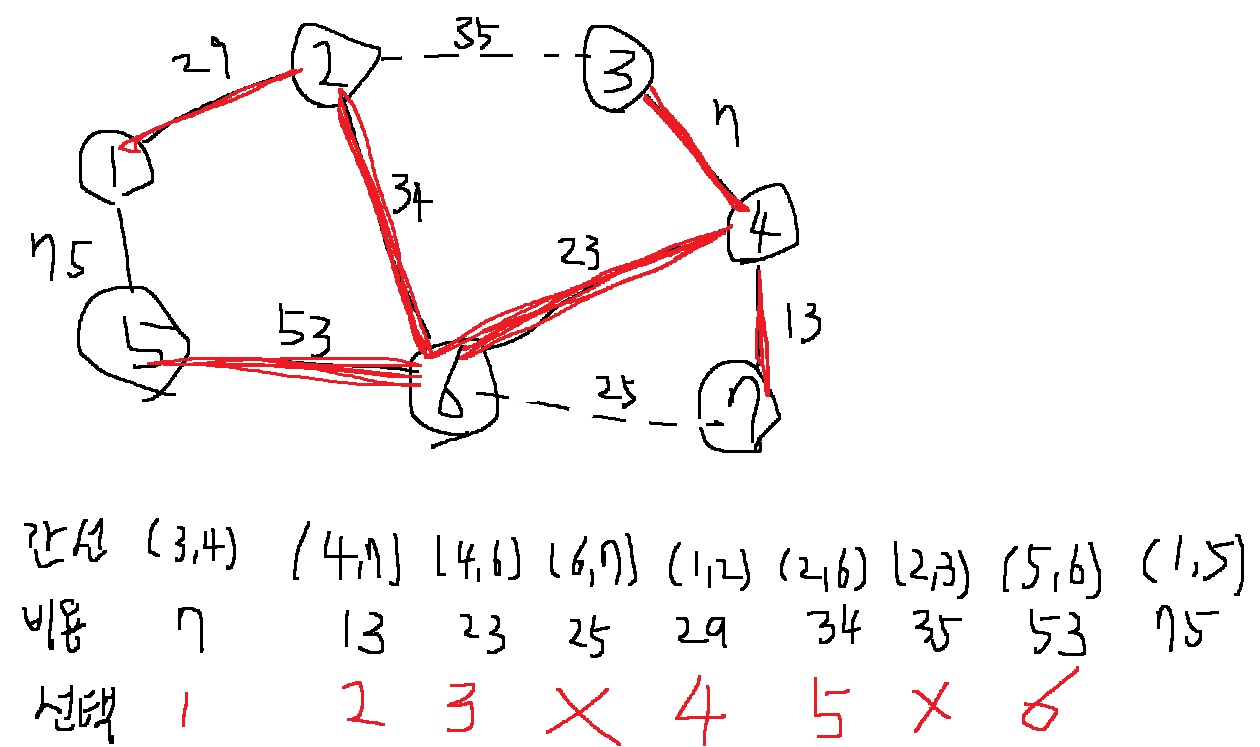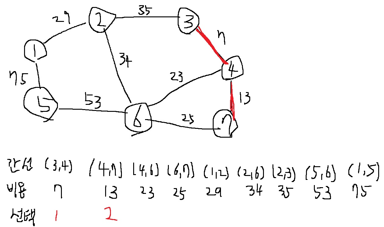그런데 6과 7은 이미 동일한 집합에 포함되어 있으므로, 신장 트리에 포함하지 않아야한다.