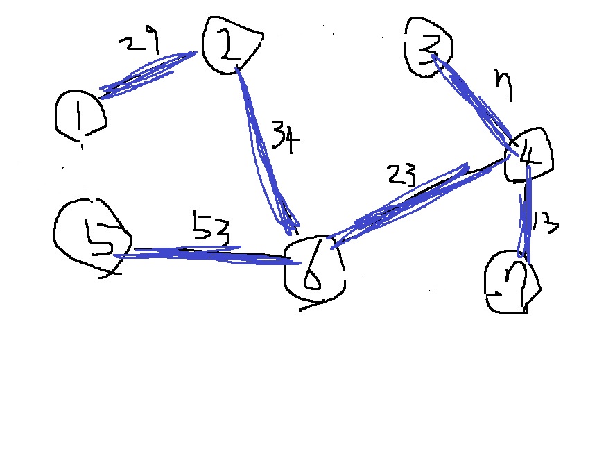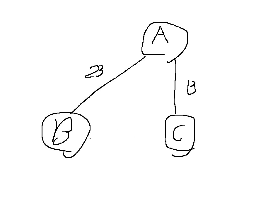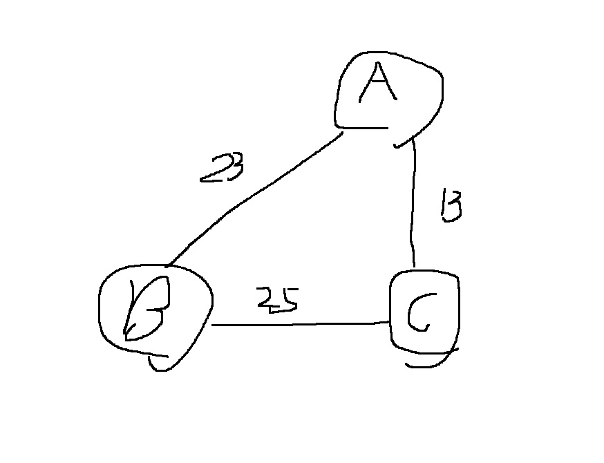 위와 같이 A-B를 연결하는 비용이 23, B-C를 연결하는 비용이 25, A-C를 연결하는 비용이 13이라면..
