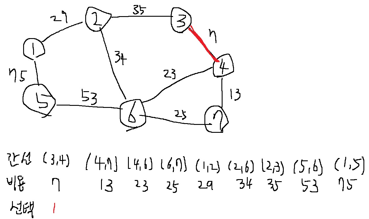 4-2) 첫번째 단계에 가장 짧은 간선인 (3,4)를 선택한다. 따라서 (3,4)가 선택되고 이것을 집합에 포함하면 된다.