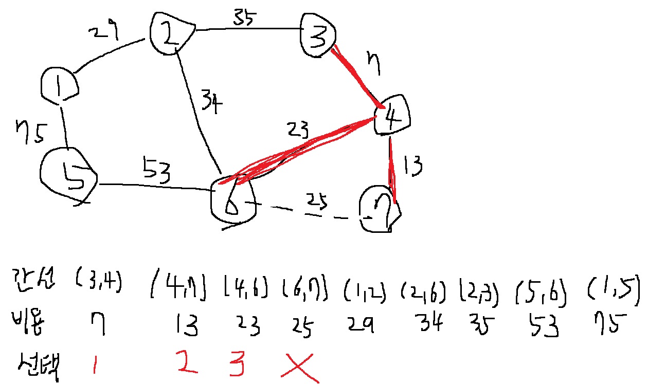 즉 (6,7)을 포함하면 사이클이 발생하므로 최소신장트리에 포함하지 않는다.