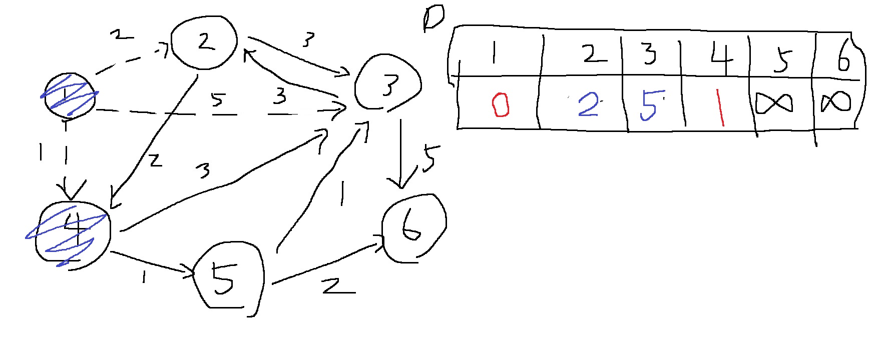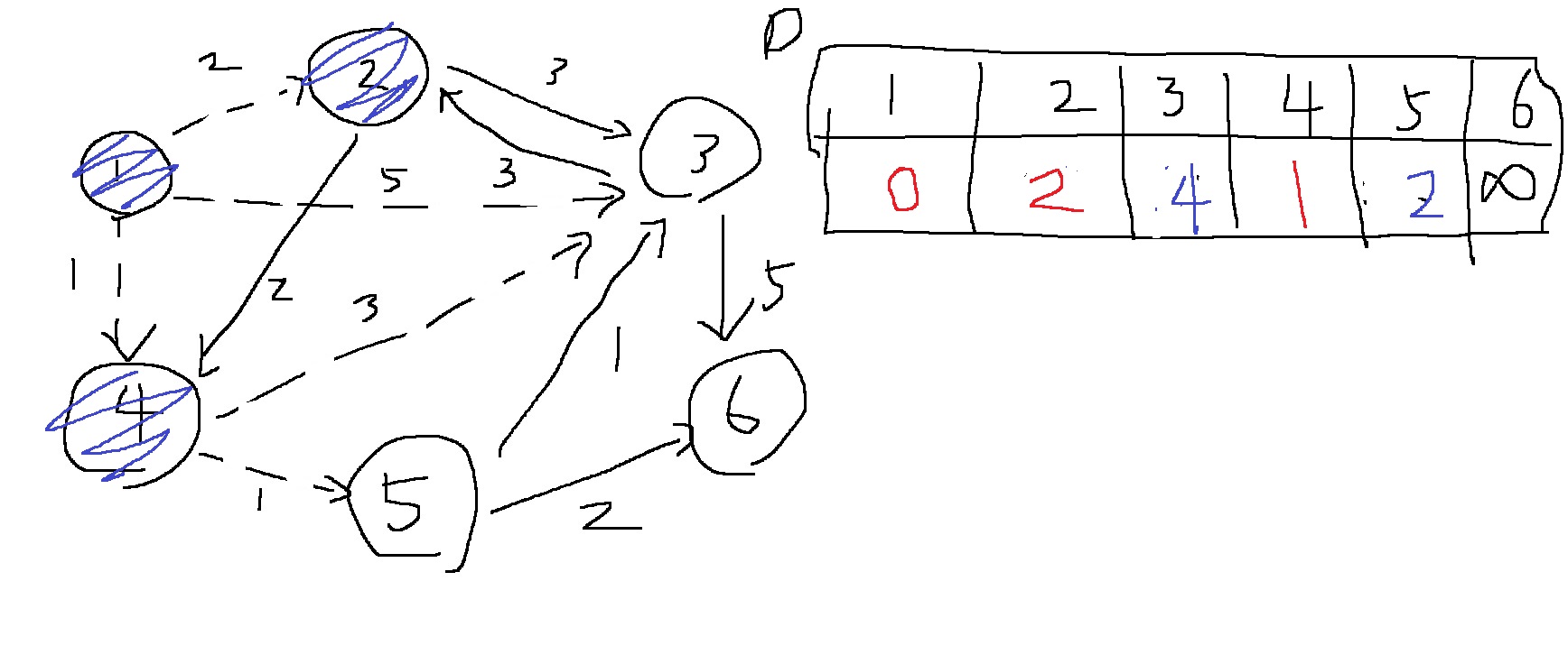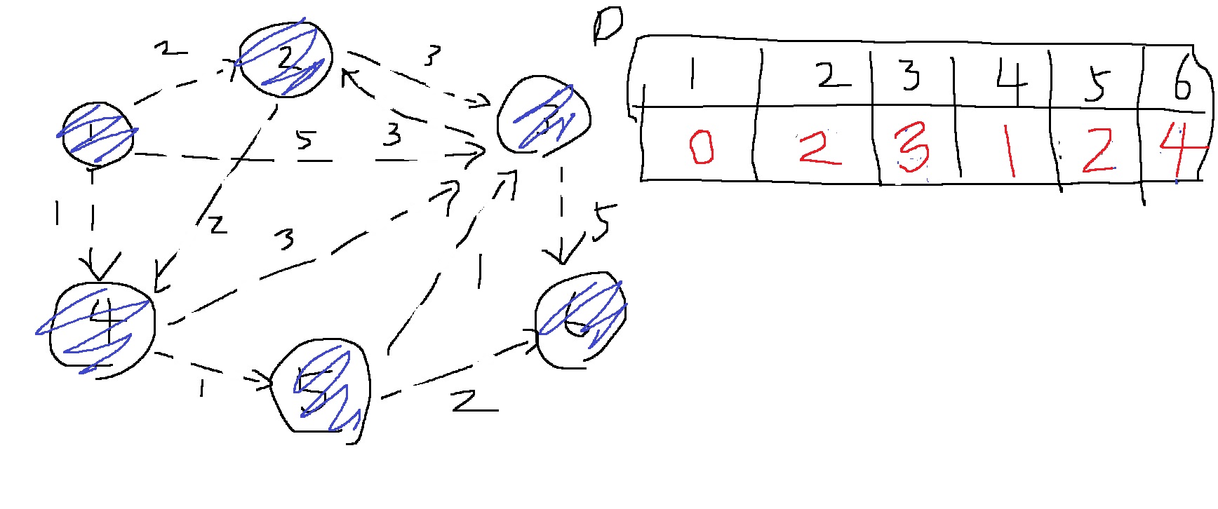 1번 노드에서 출발하여 1,2,3,4,5,6번 노드로 갈때 최단 거리로 가는 비용이 각각 0,2,3,1,2,4라는 의미가 된다.
