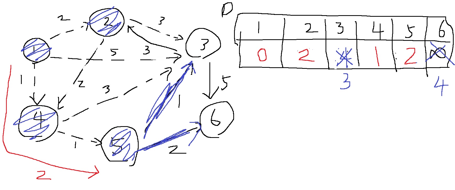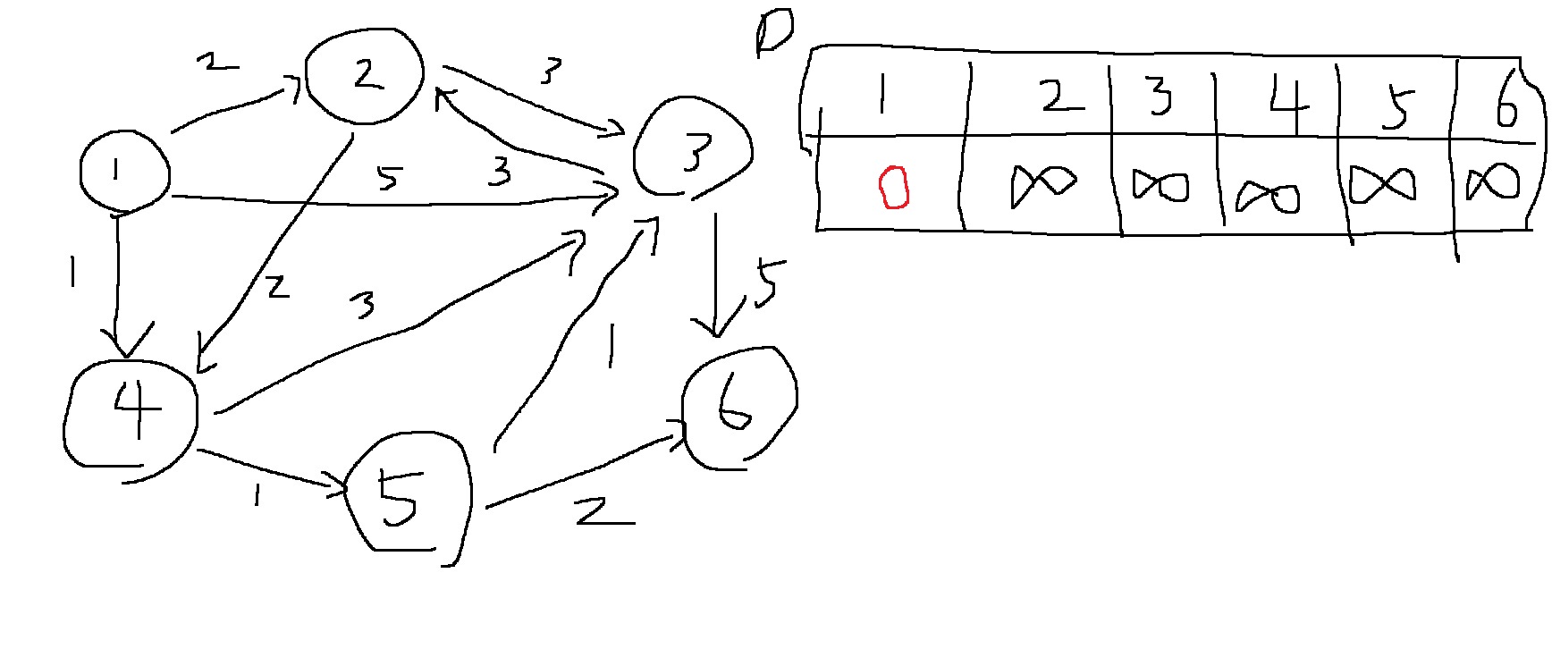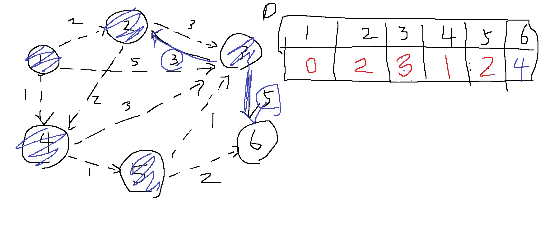 1번 노드에서 출발하여 1,2,3,4,5,6번 노드로 갈때 최단 거리로 가는 비용이 각각 0,2,3,1,2,4라는 의미가 된다.