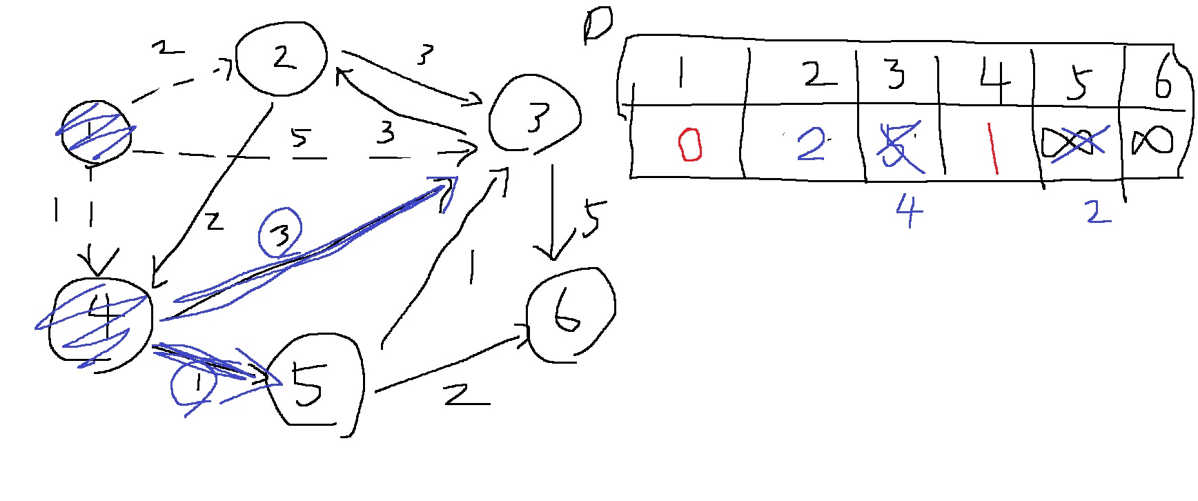 그러므로 1-4-5-3까지 가는 최단 비용은 2+1 = 3이고 1-4-5-6으로 가는 최단 비용은 2+2=4이다.