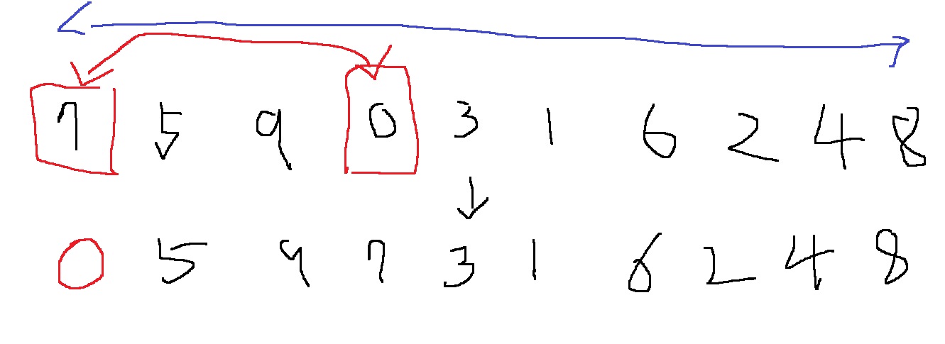 따라서 0을 선택해 맨 앞에 있는 데이터 7과 바꾼다