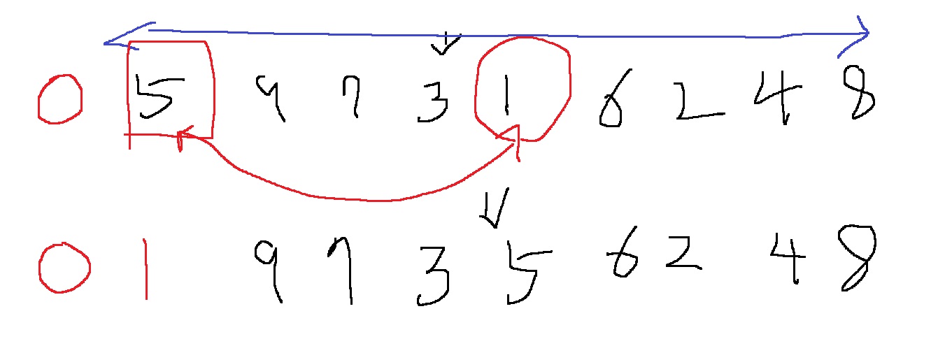 이것을 정렬되지 않은 데이터에서 가장 앞에 있는 9와 바꾼다