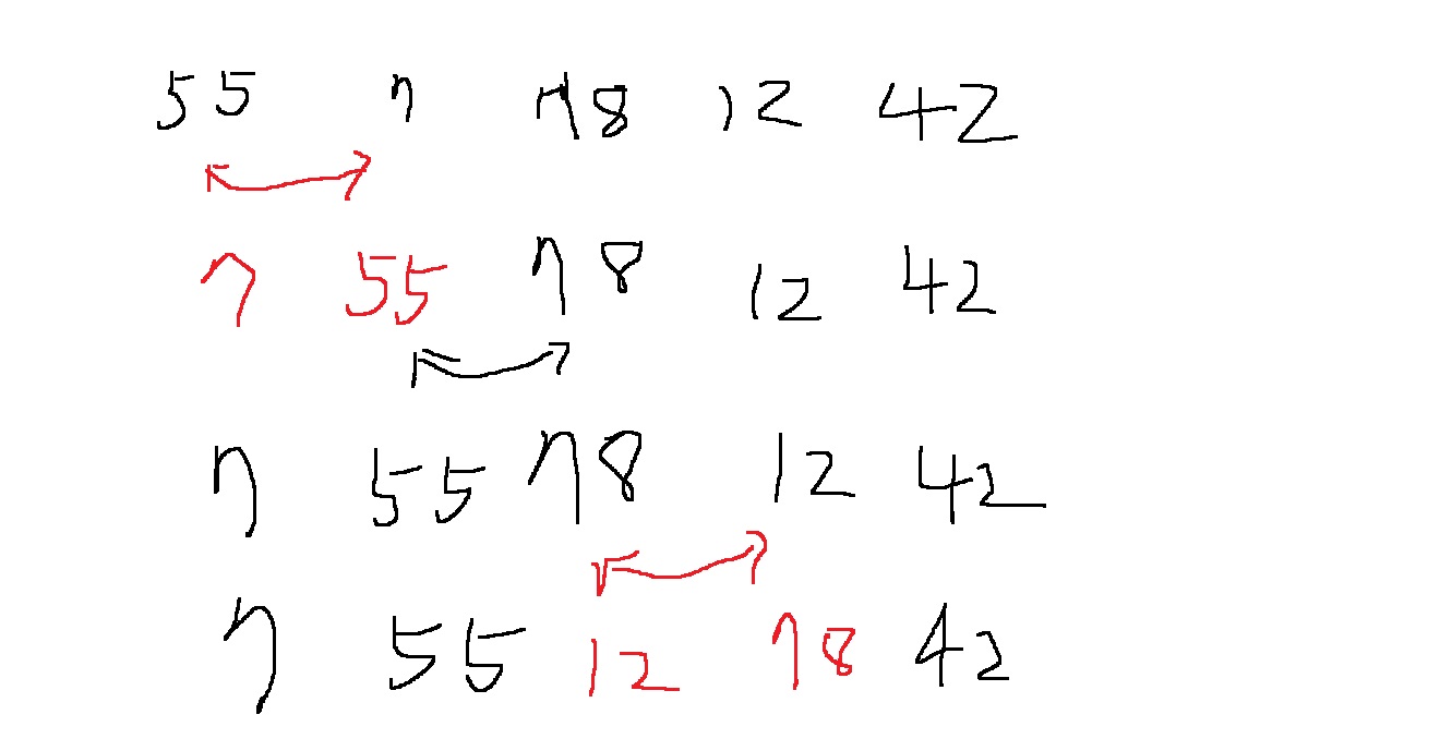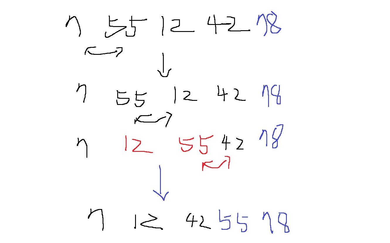 7과 12를 비교하여 12가 더 크니 자리를 바꾸지 않고, 12와 42를 비교하여 42가 더 크니 자리를 바꾸지 않는다.