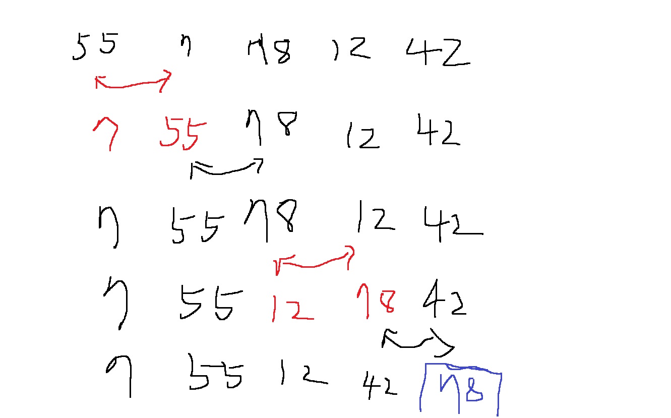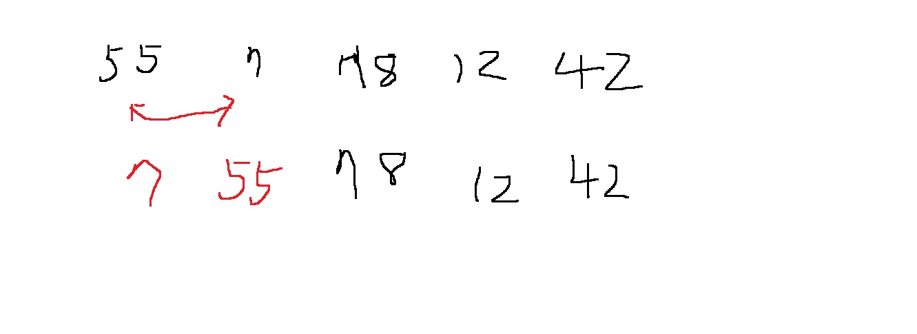55, 7, 78, 12, 42를 정렬한다고 생각해보자.
