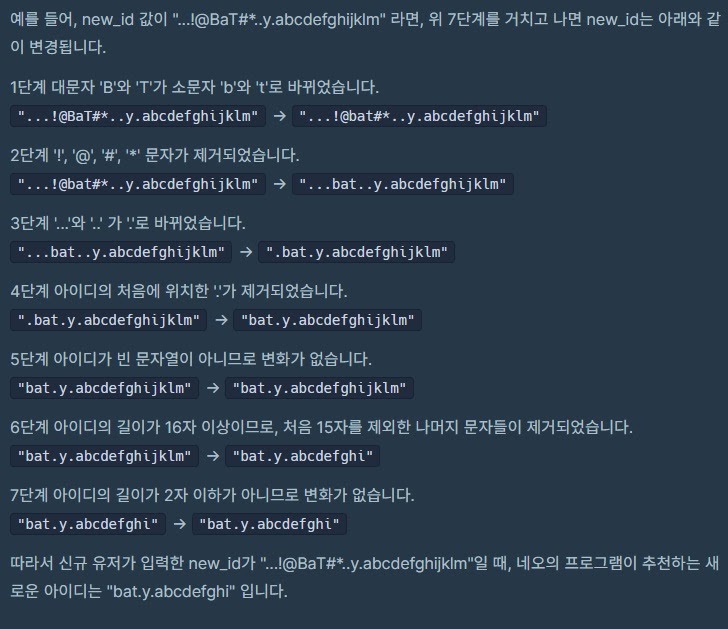 “네오”에게 주어진 첫 업무는 새로 가입하는 유저들이 카카오 아이디 규칙에 맞지 않는 아이디를 입력했을 때, 입력된 아이디와 유사하면서 규칙에 맞는 아이디를 추천해주는 프로그램을 개발하는 것입니다.