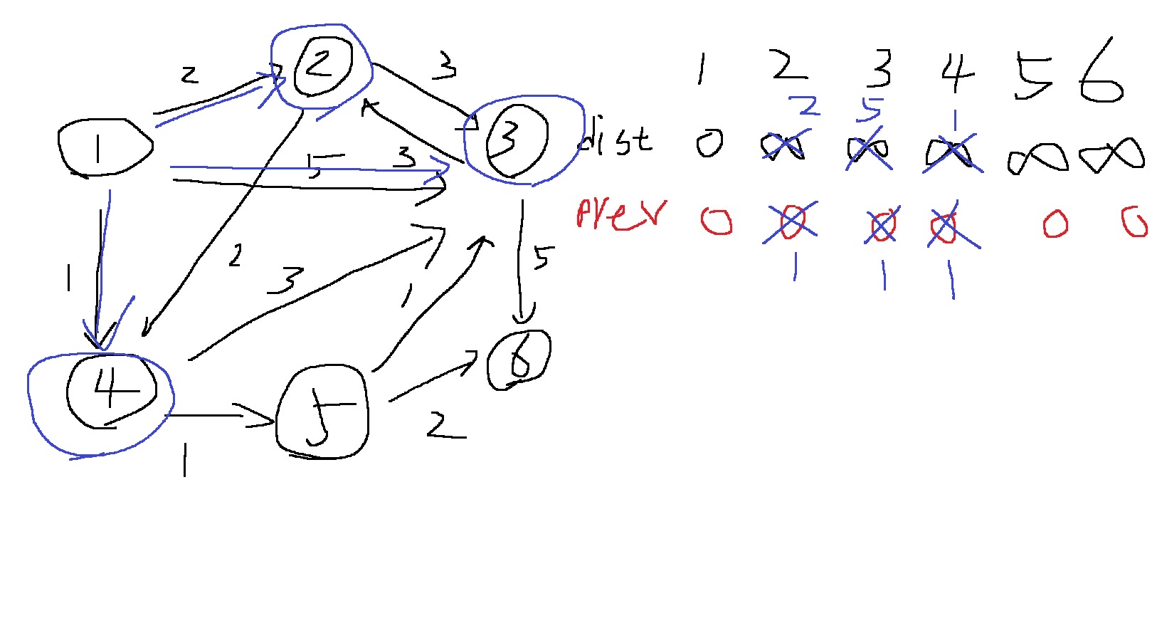 최초 시작에는 시작점 1번의 dist 값과 prev 값은 0으로 시작한다