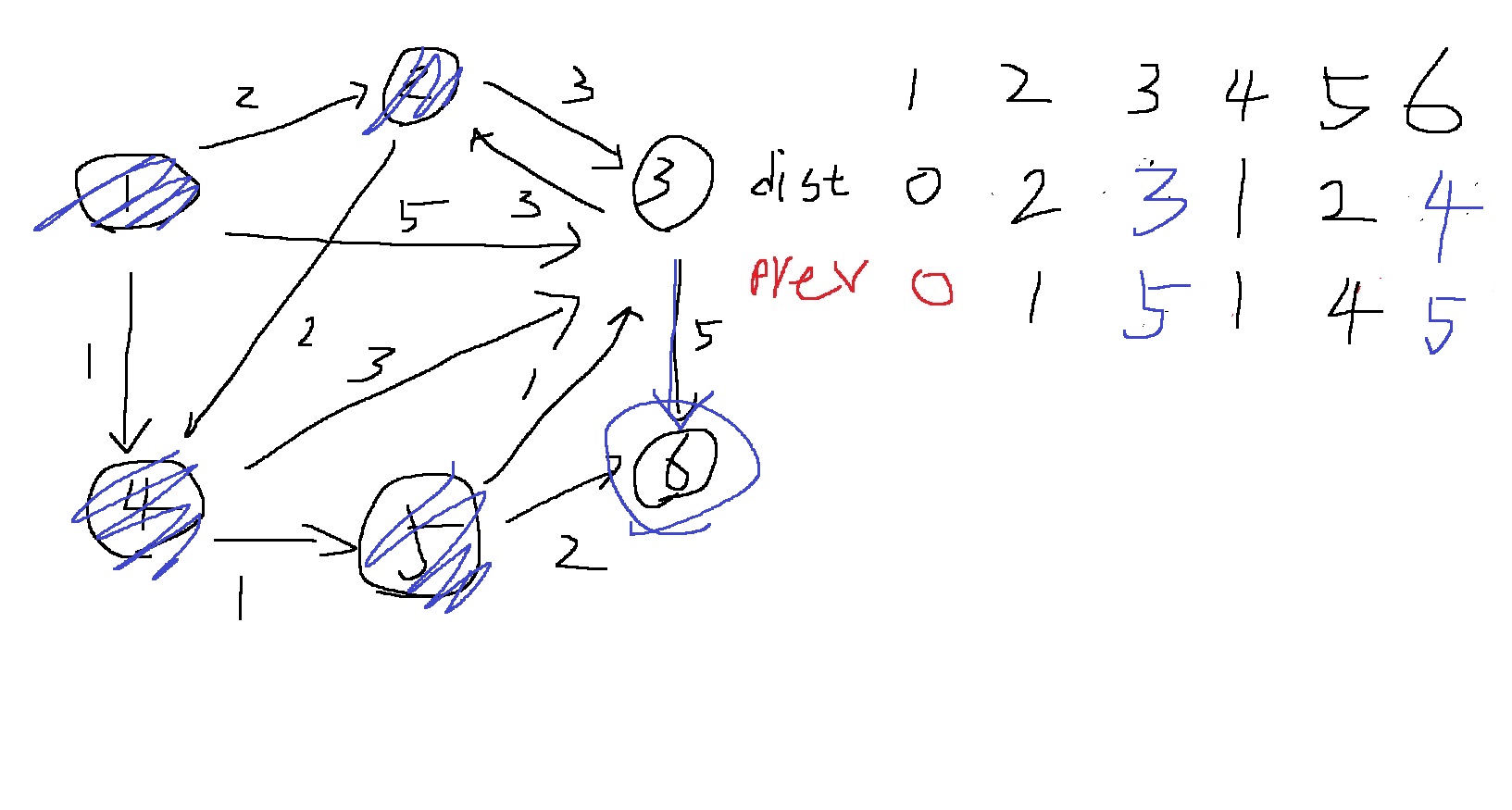 그 다음 5번으로 넘어가서 5번에 저장된 prev 값은.. 4이다. 5번과 가장 가까운 정점은 4번이라는 소리다.