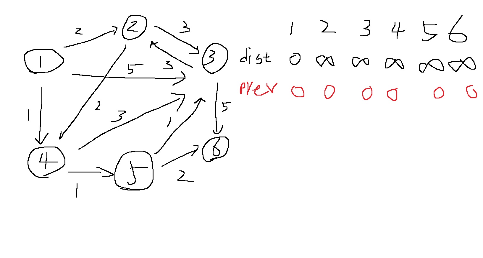 초기에는 dist 배열은 무한을 저장시키고, prev 배열에는 0을 저장시킨다.