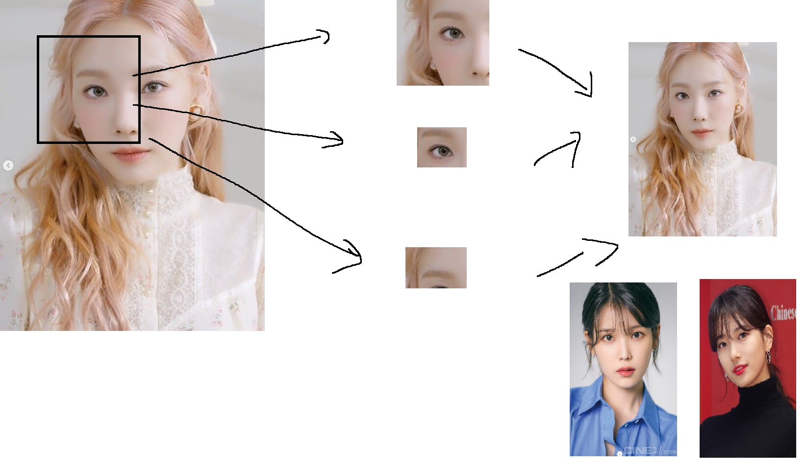 그림처럼 태연 사진을 바라볼때, 각각의 조각 부분을 살피면서 조각에서 나타나는 특징을 필터링하여, 컨볼루션 작업을 거치면