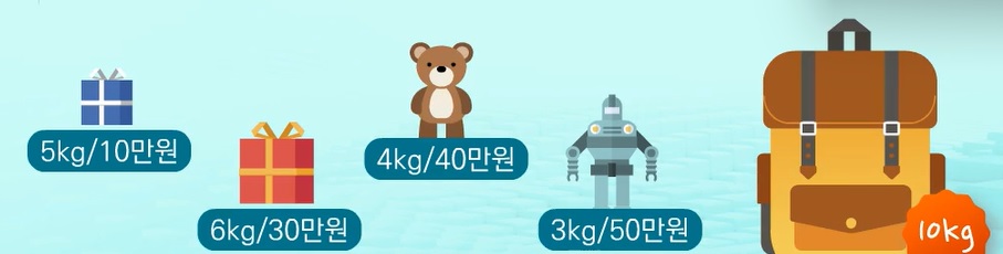 그리고 물건을 쪼개서 담을 수 없다고 가정한다. 이러한 문제는 0-1 knapsack 문제라 부르고