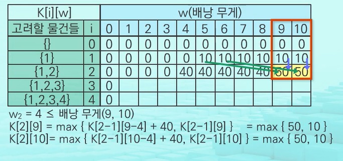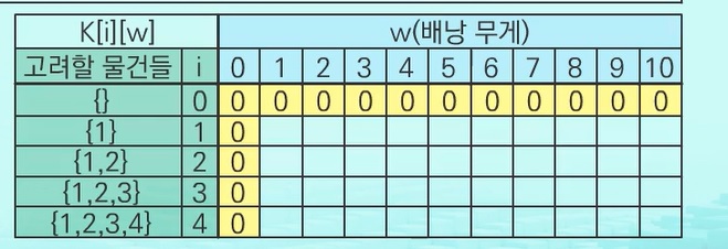 K[n][W]는 1~n번까지의 물건 [1,2,3,...,n]중에서 배낭 최대 무게 W를 넘지 않는 선에서 담을때 최대 가치