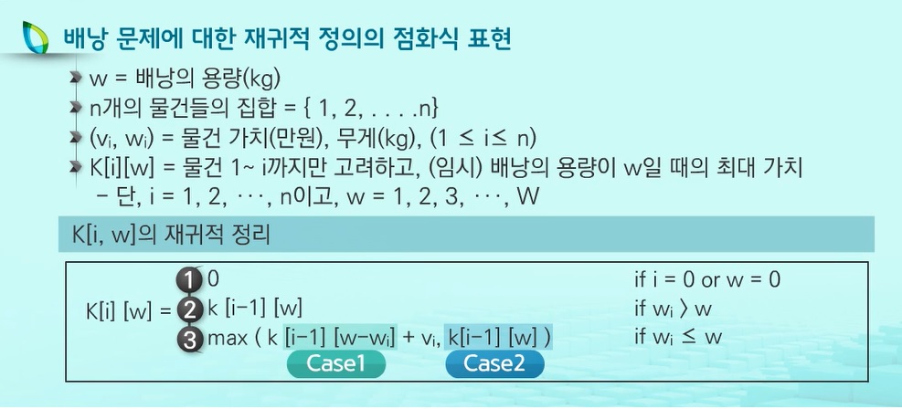 그러므로, K[n][W] = max(K[n-1][W-wn]+vn , K[n-1][W])라는 점화식을 세울 수 있다.