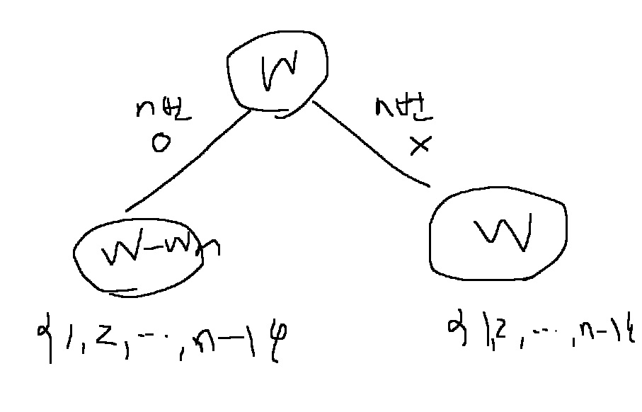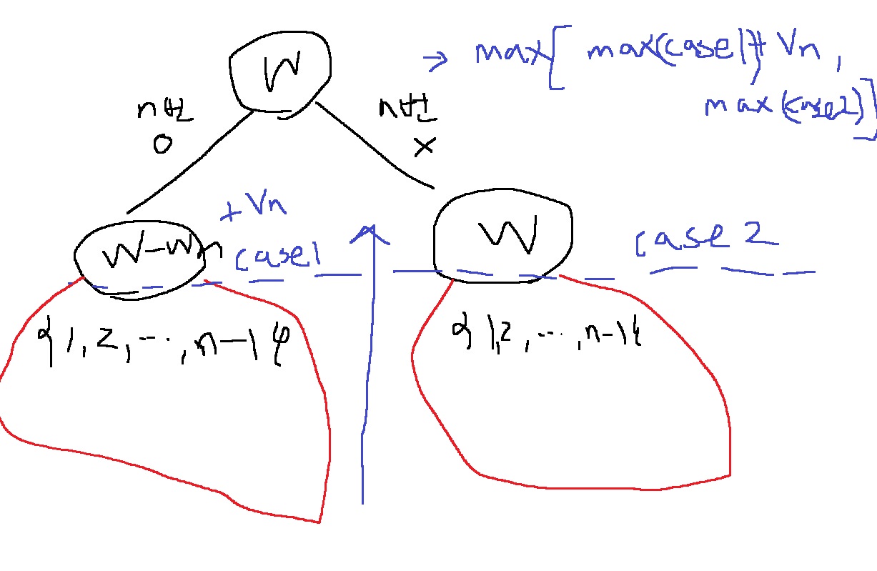 n번째 물건을 담지 않은 경우, 담을 수 있는 물건들은 {1,2,...,n-1}이고, 남은 용량은 W