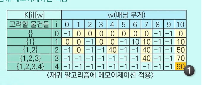 -1로 초기화된 K table을 점화식에 따라 채워나가서, 마지막 K[4][10]을 구하는 과정이다.