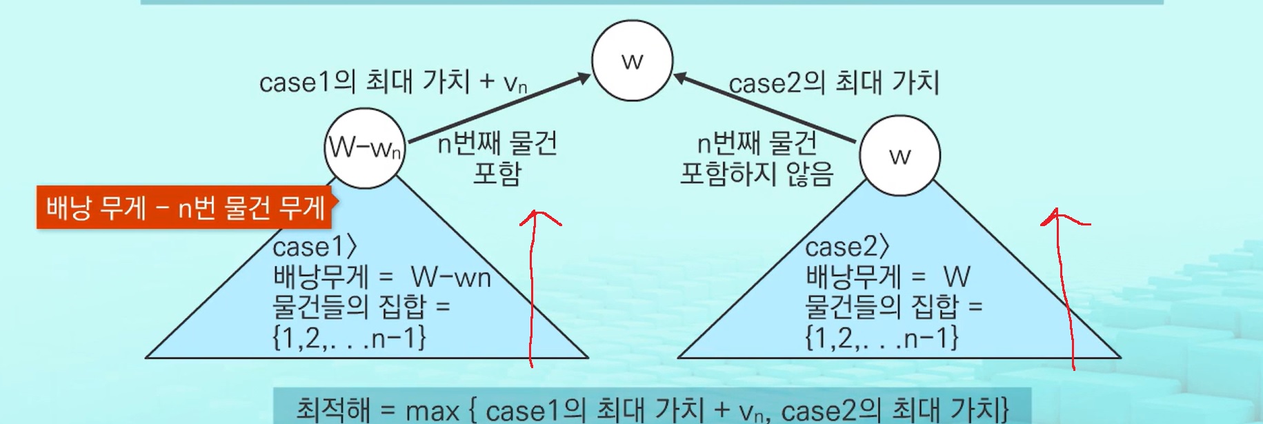 물건들의 집합 {1,2,3,4,5,...,n}에 대하여.. n번째 물건을 배낭에 담느냐, 담지 않느냐로 나눌 수 있다